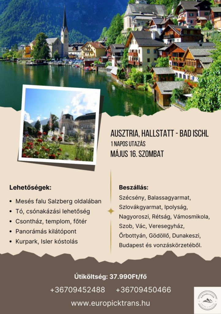 Egynapos kisbuszos kirándulásunk során Ausztria egyik legszebb alpesi falujába, Hallstattba látogatunk el. A festői tópart, a hegyekkel körülölelt óváros és a hangulatos faházak különleges élményt nyújtanak minden évszakban. Sétát teszünk a történelmi városrészben, megcsodáljuk a Hallstatti-tavat, valamint lehetőség nyílik a híres Csontkápolna (Beinhaus) és a helyi templom megtekintésére is. Csontkápolna belépő: kb. 3€.