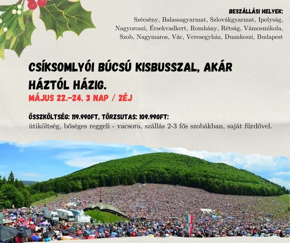 Várlátogatás után pedig Csíksomlyóra utazunk tovább: A Csíkszereda melletti Csíksomlyó a Kárpát-medence legismertebb zarándokhelye, a minden évben megrendezett pünkösdi búcsú a legnagyobb katolikus rendezvény egész Erdélyben. A neobarokk stílusú ferences kegytemplomban őrzik a világ egyik legnagyobb méretű kegyszobrát, a csodatévő Mária-szobrot. Kegytemplom után lehetőség van megtekinteni Makovecz Imre által tervezett Hármashalom-oltárját, ahol búcsú napján a szentmisét tartják. Menet közben nem szabad kihagyni a borvízforrást sem.