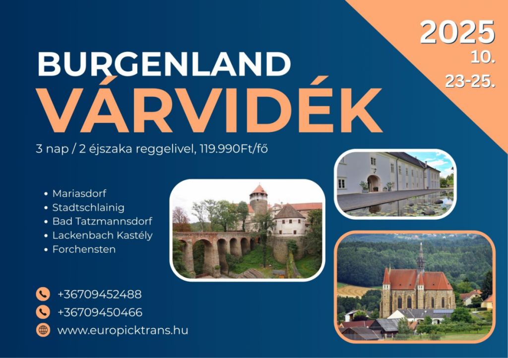 Ezen a napon korán reggelizünk, amire 7 órától lesz lehetőség, a reggeli elfogyasztása után Lakompak/Lackenbach kastély a cél, a reneszánsz stílusú épületegyüttes, az Esterházy család egyik legrégebbi kastélya, ahol 10 órakor magyar idegenvezető segít a kastély megismerésében, a belépés Burgenland kártyával ingyenes, az idegenvezetés 2 Eur/fő.